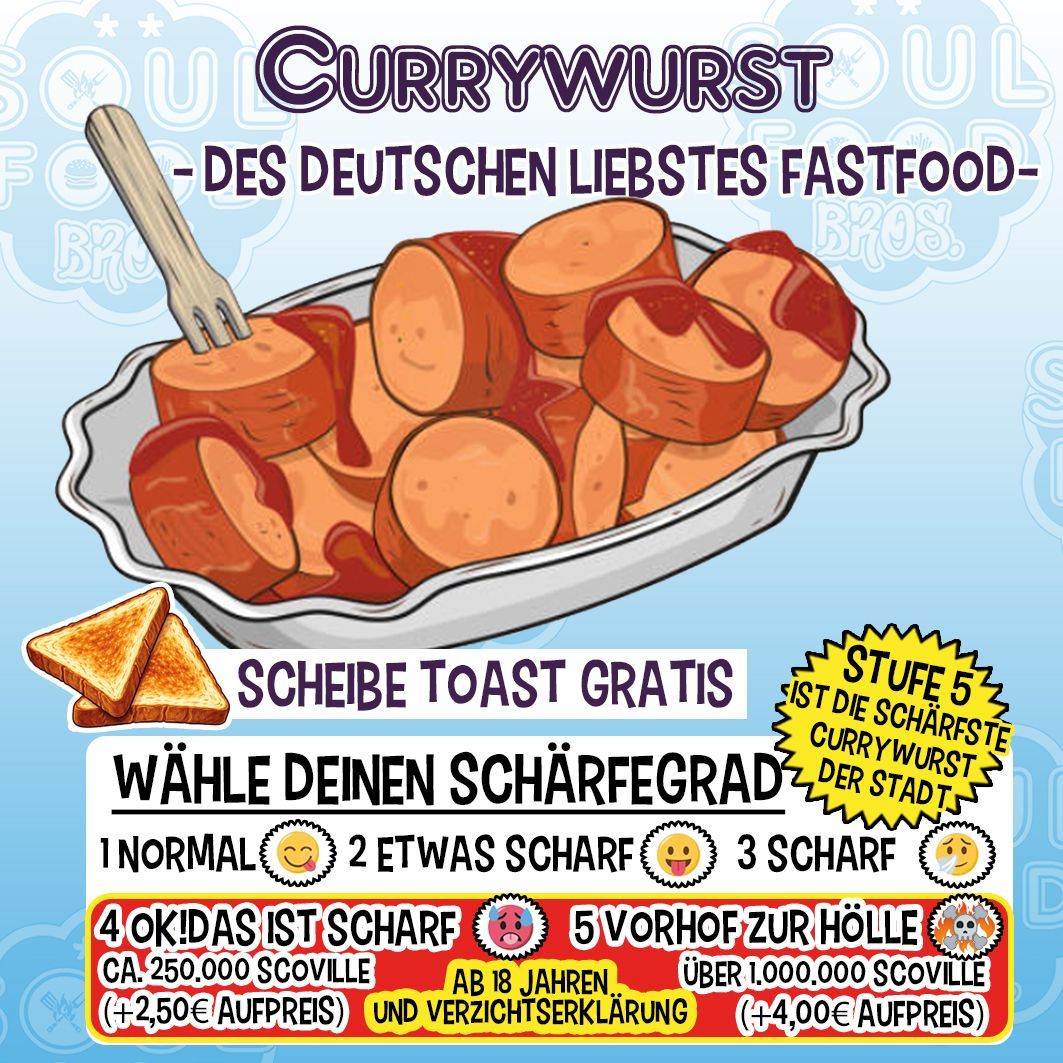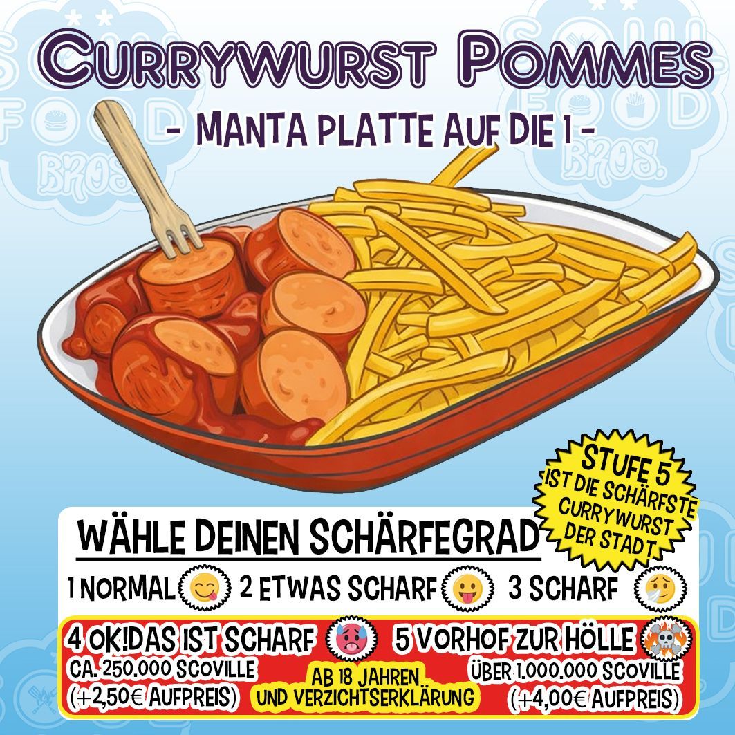 Bei unseren Currywürsten kannst du aus 5 verschiedenen Schärfegraden wählen, von "Normal" bis zum "Vorhof zur Hölle" welche weit über 1 Millionen Scoville hat und somit die schärfste Currywurste der Stadt ist.